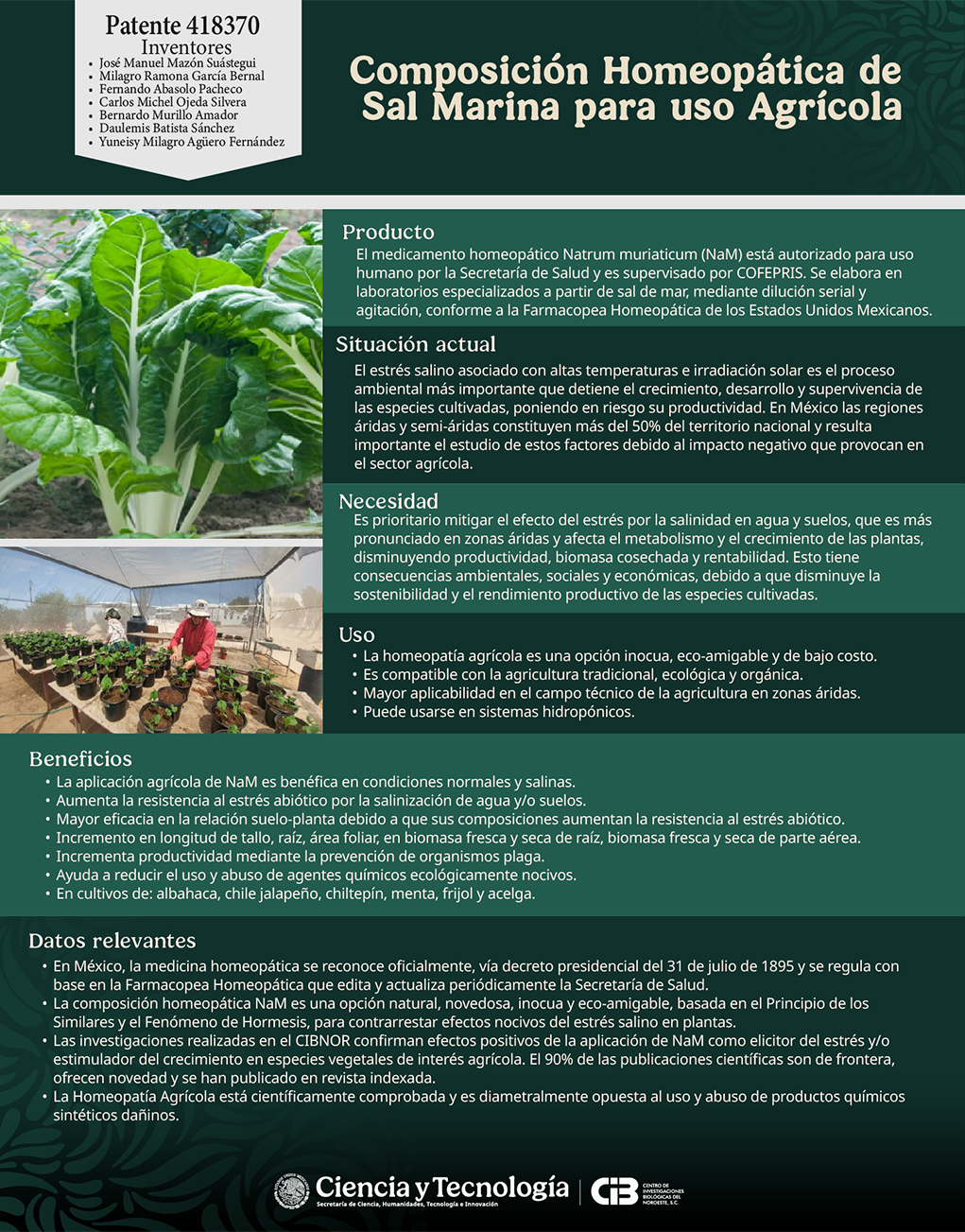 A continuación se exponen las patentes otorgadas al Centro de Investigaciones Biológicas del Noroeste, S.C. derivadas de desarrollos tecnológicos del personal científico y tecnológico:
